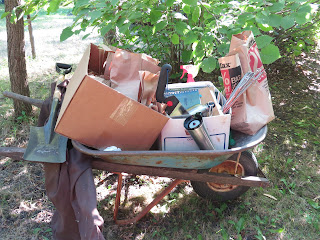 Here is the fancy hazelnut picking cart with all the essentials: Bags, notebooks, label supplies, water for the pickers…