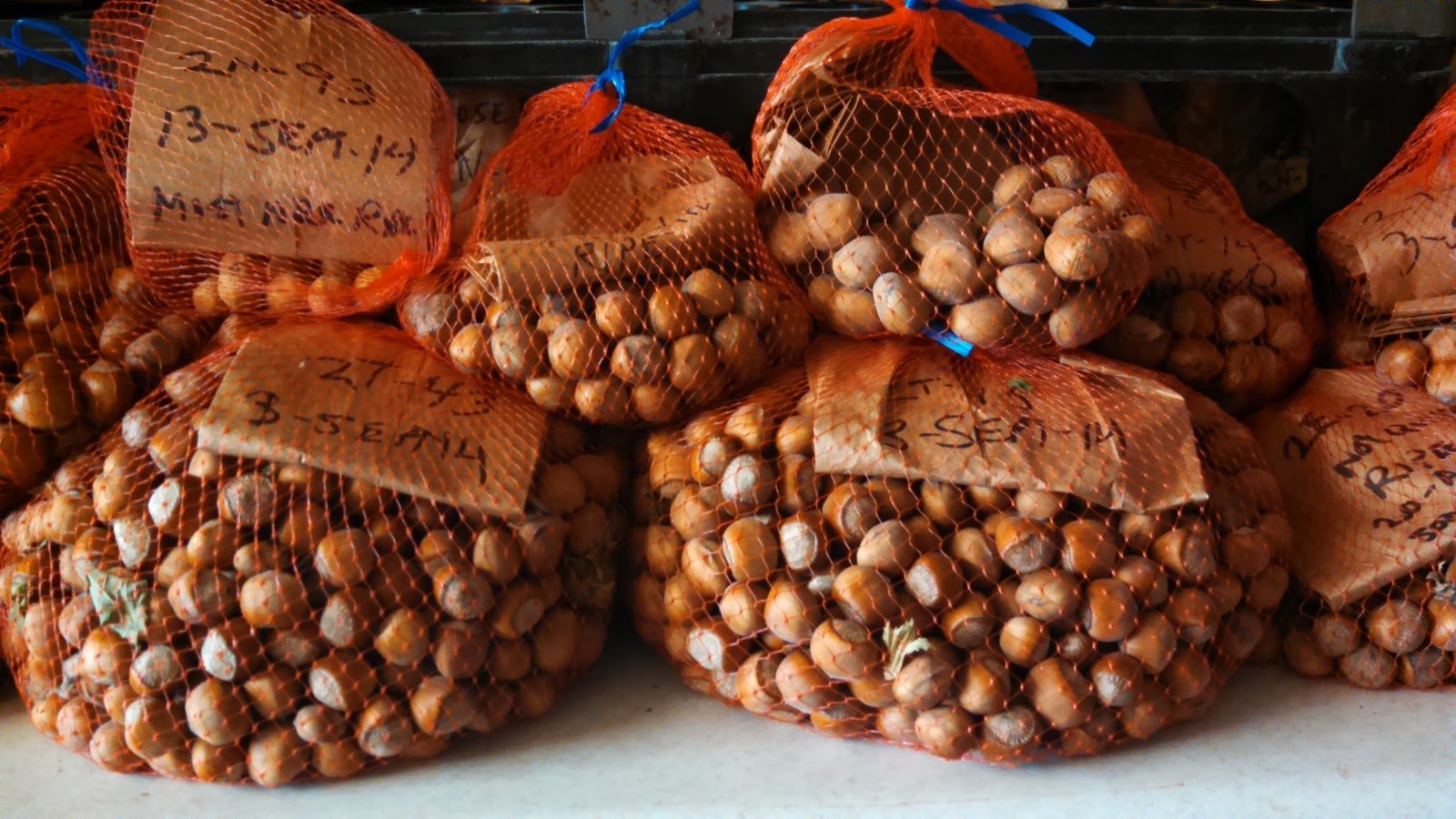 After the nuts are separated from the husk they are continued to be dried down in mesh bags for a couple more weeks.