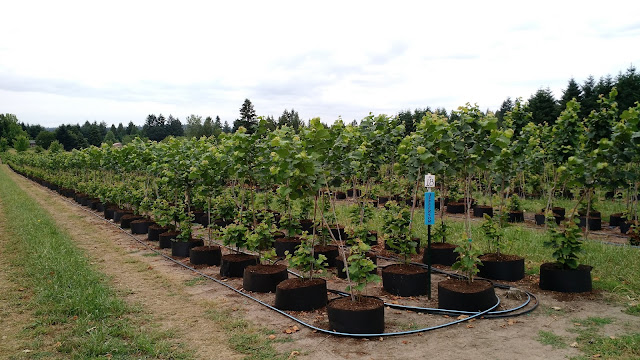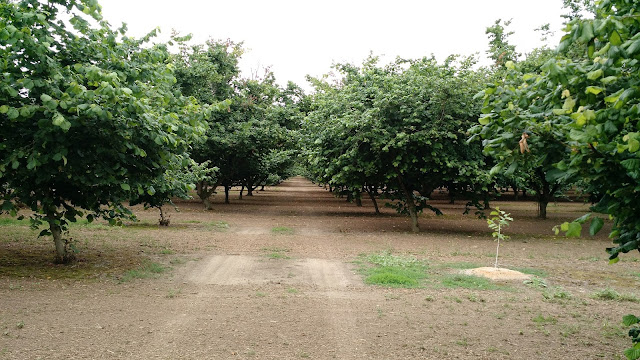 Here you can see a mature hazelnut orchard in Oregon. The small tree at the right was planted to replace a plant that affected by EFB. The ground is very flat and was being graded while we were there. This is done to allow a mechanical sweeper to pick up the nuts when they fall to the ground.