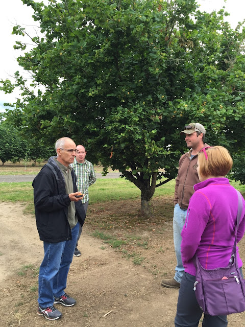 Loren Berkemier in the brown shirt gave us a very interesting tour of their hazelnut nursery.  He showed us the different types of cultivars that they are propagating. Loren informed us that they receive new introductions from Oregon State University Hazelnut Breeding Progam to test and propagate. Their main concern is resistance to Eastern Filbert Blight, which has affected a lot of their better hazelnut cultivars.