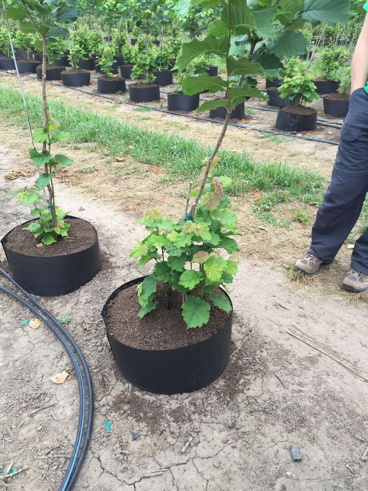 Here you can see a mature hazelnut orchard in Oregon. The small tree at the right was planted to replace a plant that affected by EFB. The ground is very flat and was being graded while we were there. This is done to allow a mechanical sweeper to pick up the nuts when they fall to the ground.