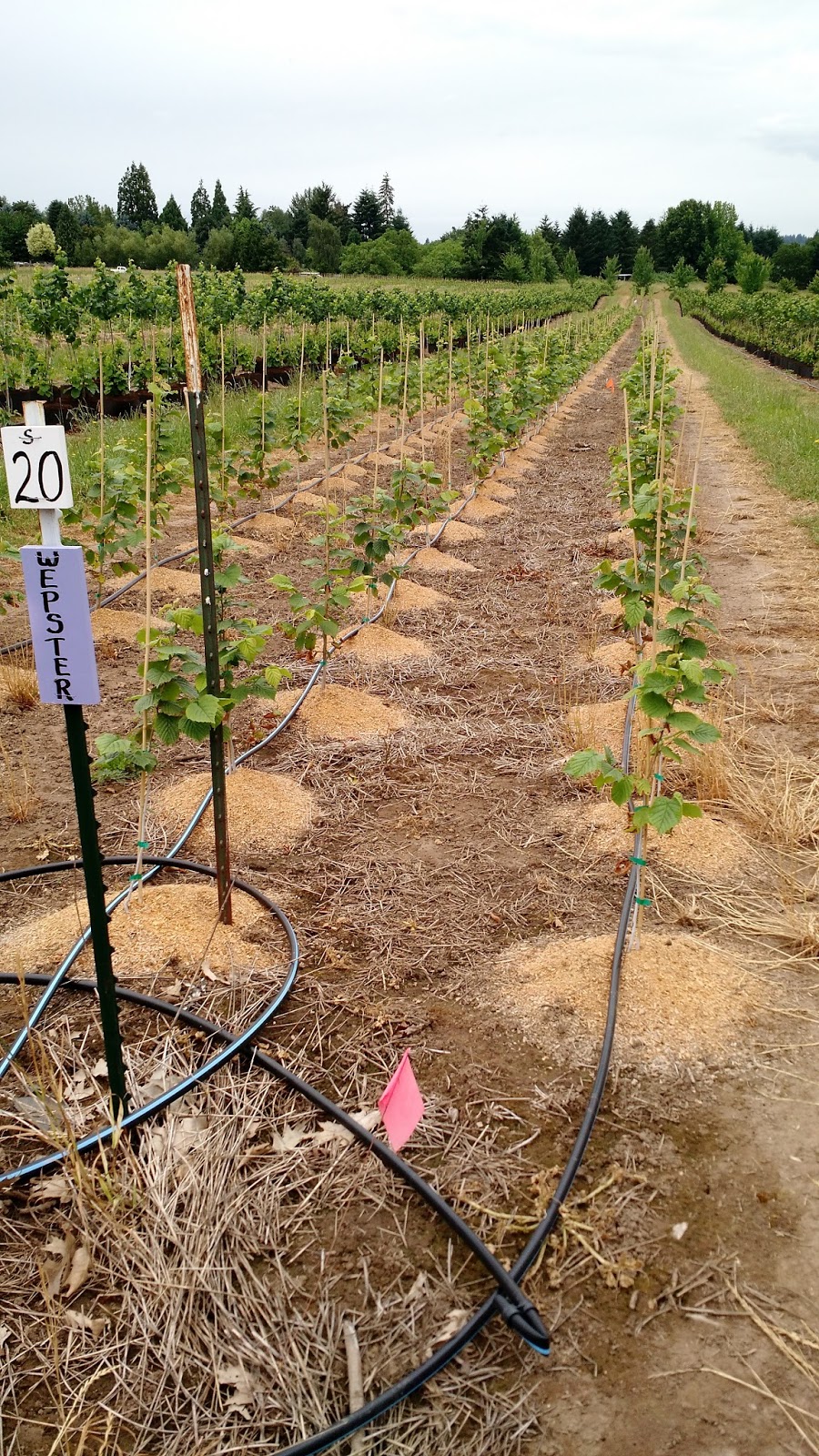 Loren Berkemier in the brown shirt gave us a very interesting tour of their hazelnut nursery. He showed us the different types of cultivars that they are propagating. Loren informed us that they receive new introductions from Oregon State University Hazelnut Breeding Progam to test and propagate. Their main concern is resistance to Eastern Filbert Blight, which has affected a lot of their better hazelnut cultivars.