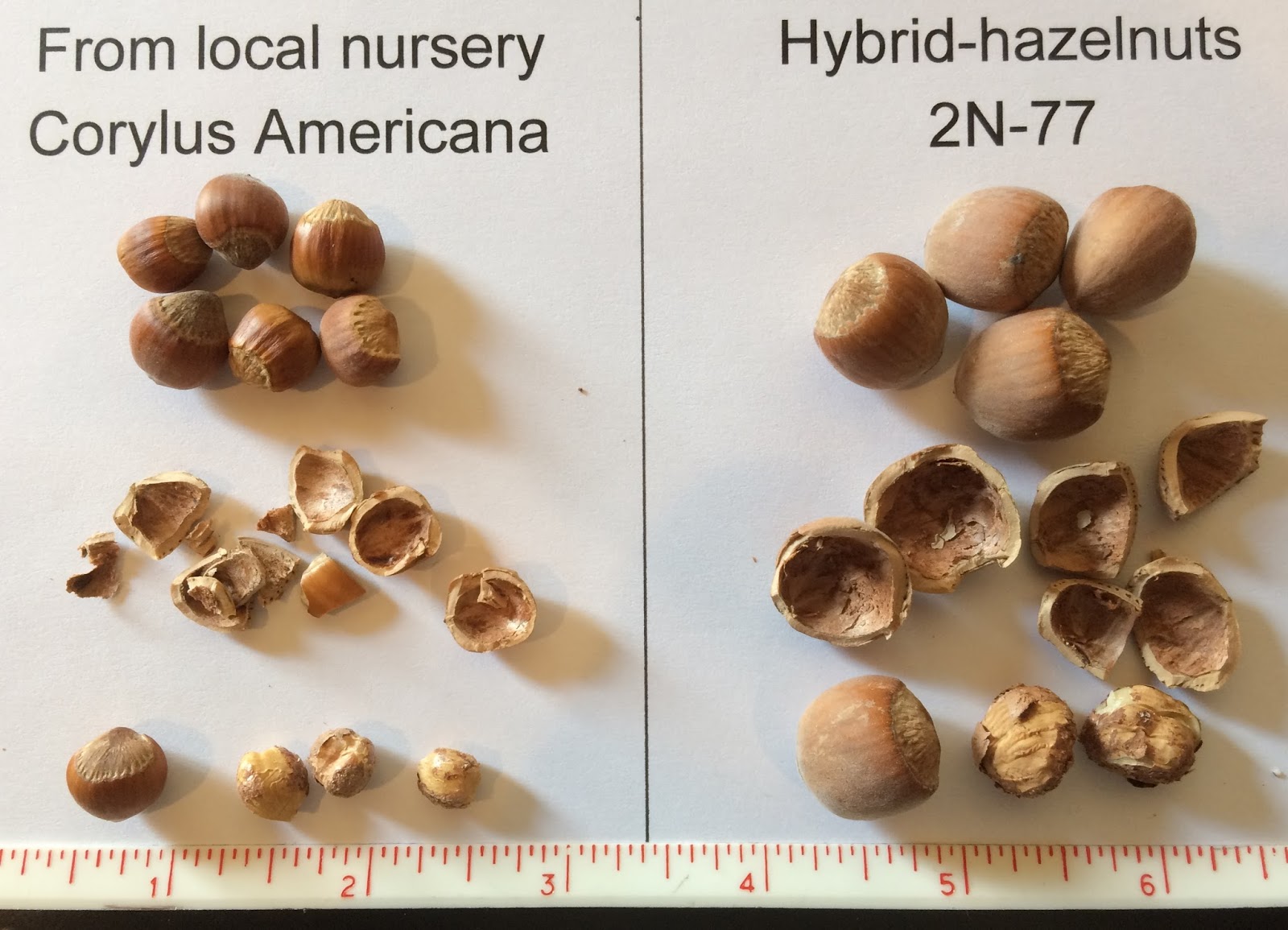 The nut on the right 2N-77 is a hybrid plant that’s growing in my orchard. It produces a nice crop of larger great tasting nuts.  I’m probably a little biased, but they are good:)