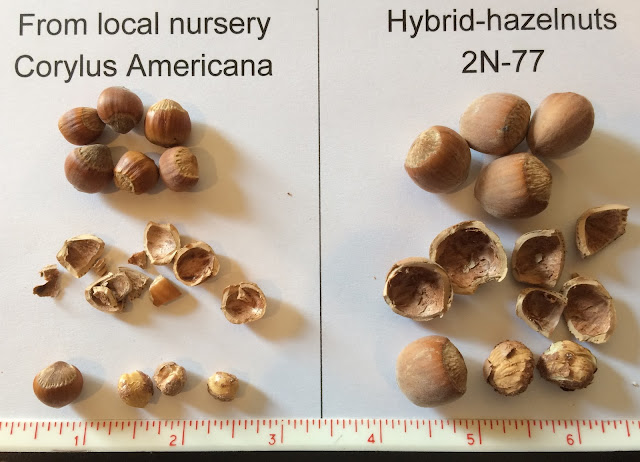 This plant that produced the hazelnuts on the left was bought at a local nursery and has a large crop of small bitter nuts every year.  I did remove this plant from the orchard this fall.