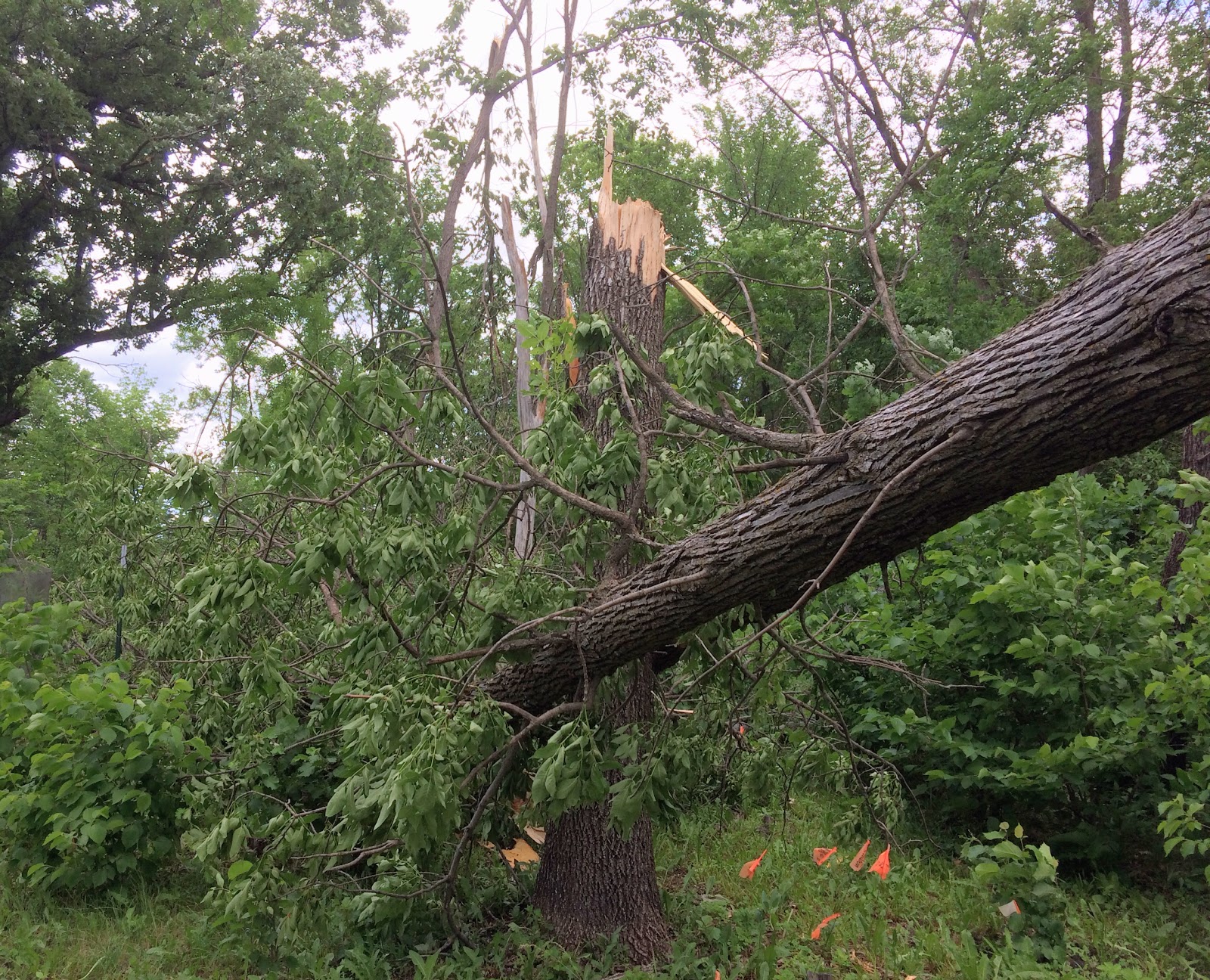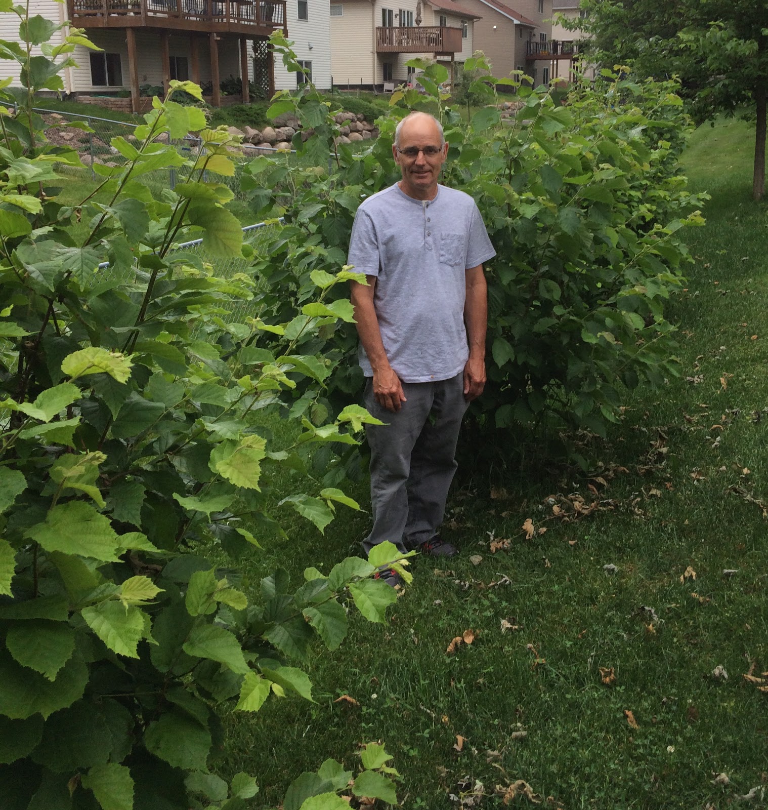 This was taken while visiting my son in Lino Lakes, MN, which had a severe storm with lots of hail a few days before we arrived. In this picture I was checking the damage to the hazelnuts that I planted four years ago.
