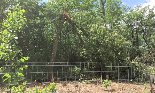 This downed ash tree was at the other side of the hazelnut orchard with the new seedlings from this year. I did finally get this tree down without any damage to the new trees but the fence had to be repaired.