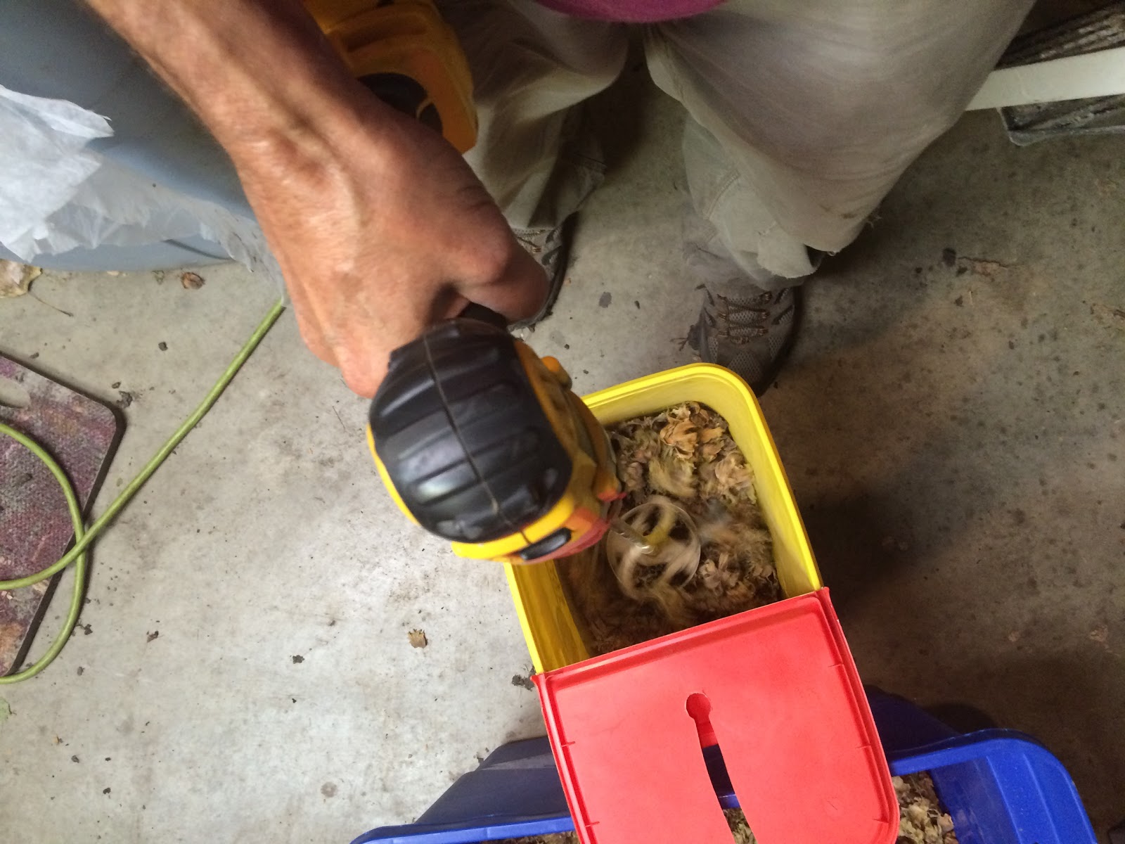 When the husks are dry enough they are placed in a bucket and I use a drill with a paint mixer and 2 added weights to separate the nuts from the husk.